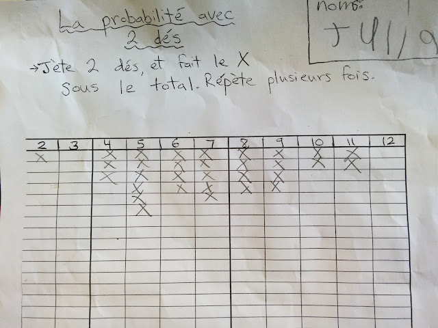 In math we focused on better understanding place value. Place value is the idea that where a digit is located in a given number determines the value that digit represents. For example, the "8" in 18 represents 8 but the "8" in 81 represents 80. We started off with counting a pile of pennies, grouping them into piles of 10. We counted by 10's until we ran out of piles, and then we added on the last remaining pennines 1 by 1. I introduced the vocabulary of "tens" and "ones" (dizaines and unités in French) in relation to our counting. The next day I switched the 64 with the 46 on our hundred chart. I asked the kids if they noticed anything peculiar, and when they did I acted as if it was no big deal because both numbers had a 6 and a 4. I asked them to explain what the difference was if the 4 was in the spot on the right or the spot on the left. Many kids have developed an intuitive understanding of this distinction, but they had trouble articulating it. We finally got around to the idea that when the 4 was on the right, it meant 4 "unités" and when it was on the left it meant 4 "dizaines".